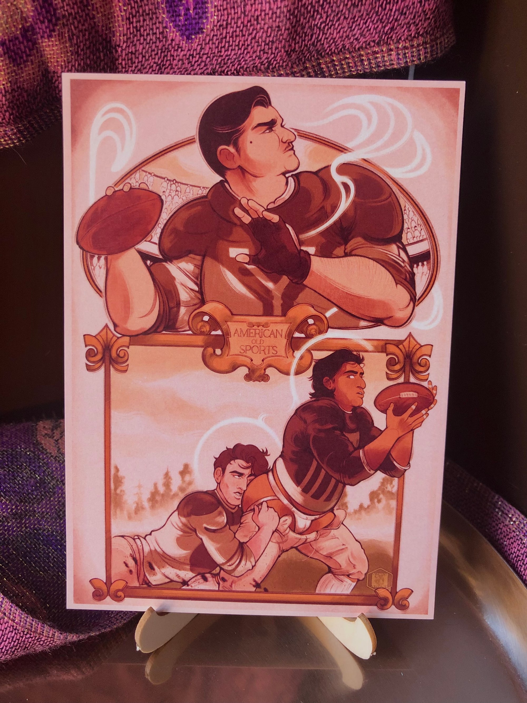 Tom, Nick, and Gatsby having a quick game of football. 4x6 inches mini