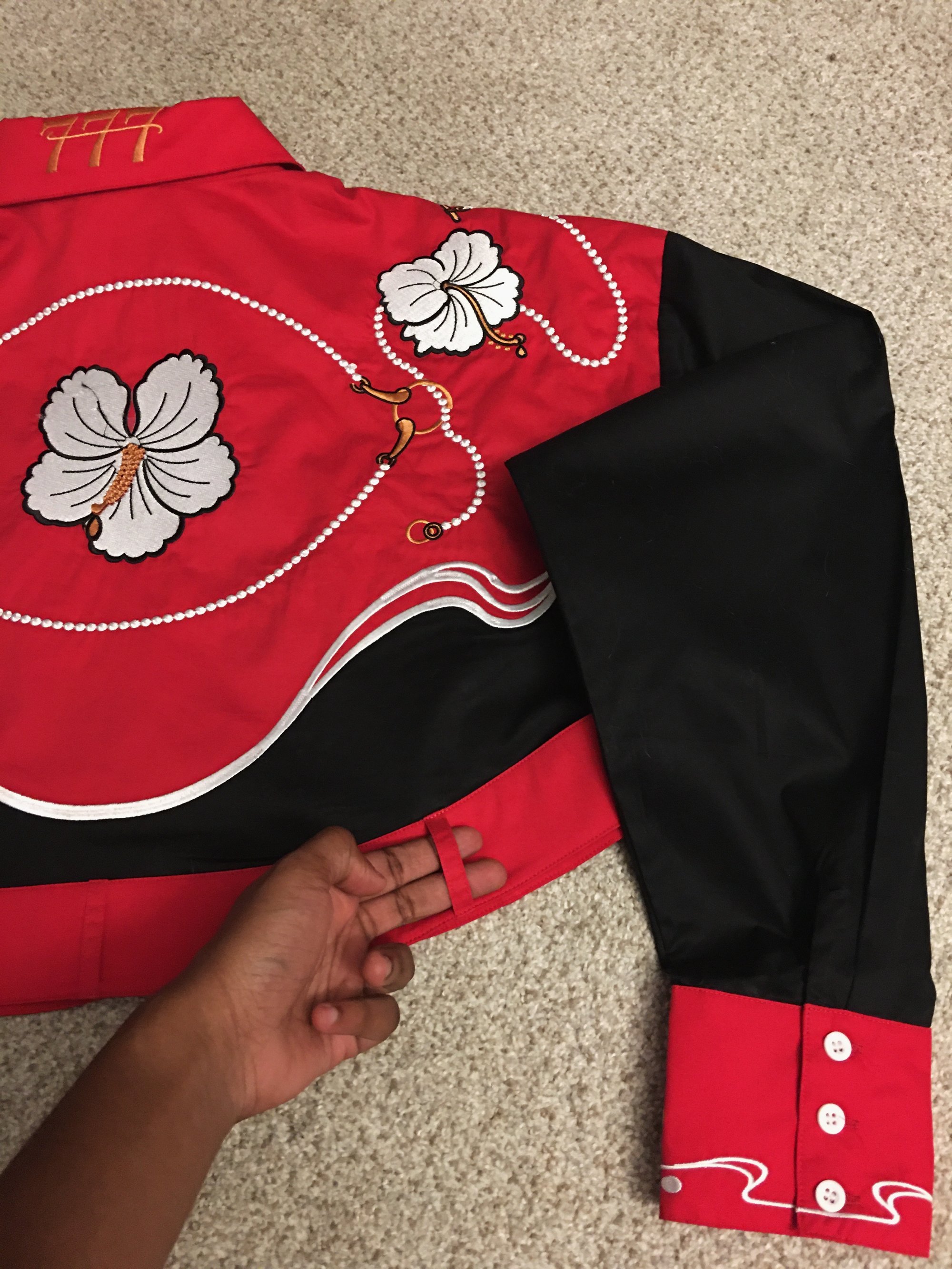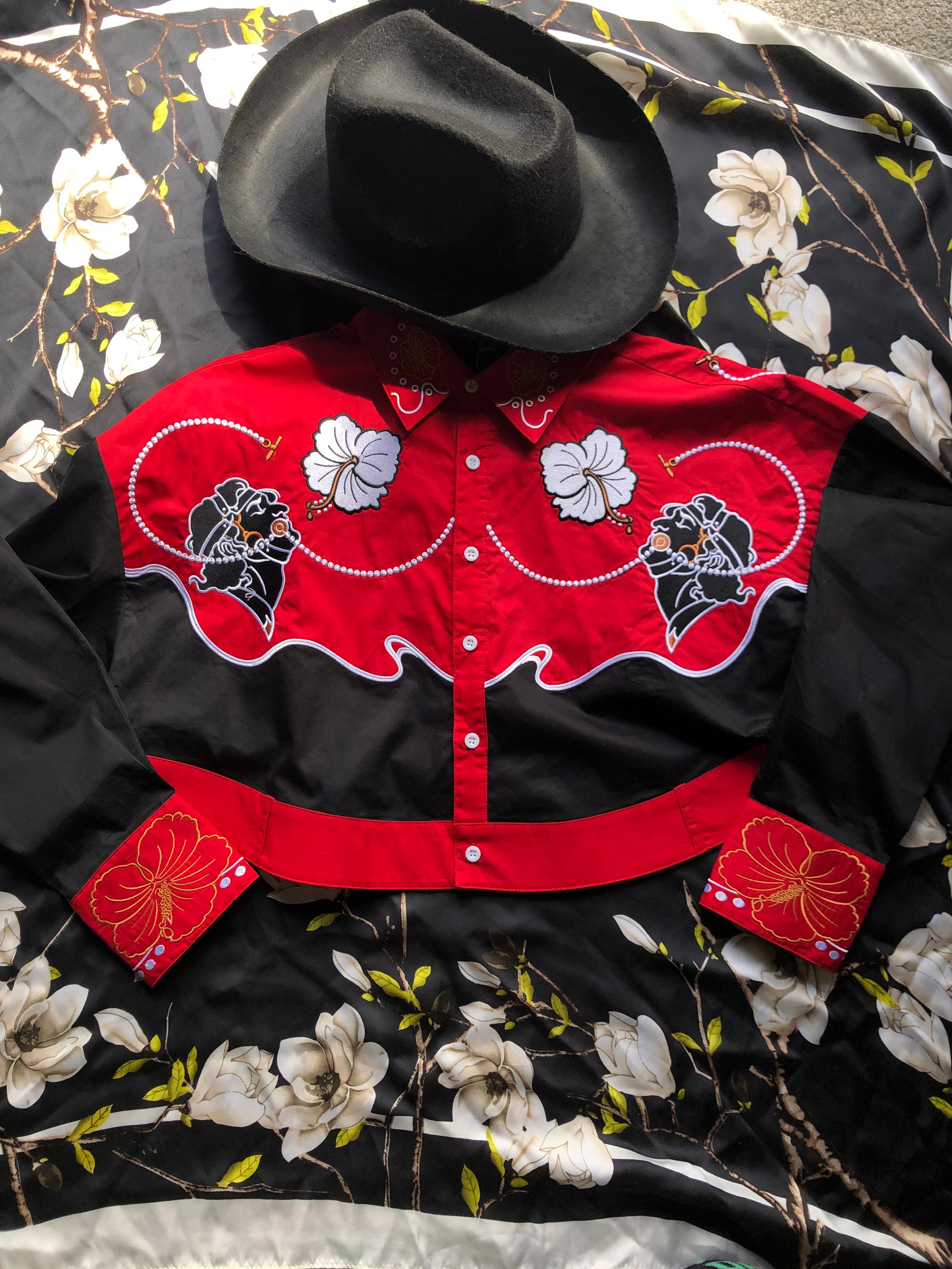 This is a 100% cotton, curved crop top with original embroidered designs featuring weeping hibiscus, strings of pearls, and a slutty southern boy with a bridle in his mouth. Belt loops along the crop trim for additional styling. Feel luxuriously southern in this 777 Saint Monroe original